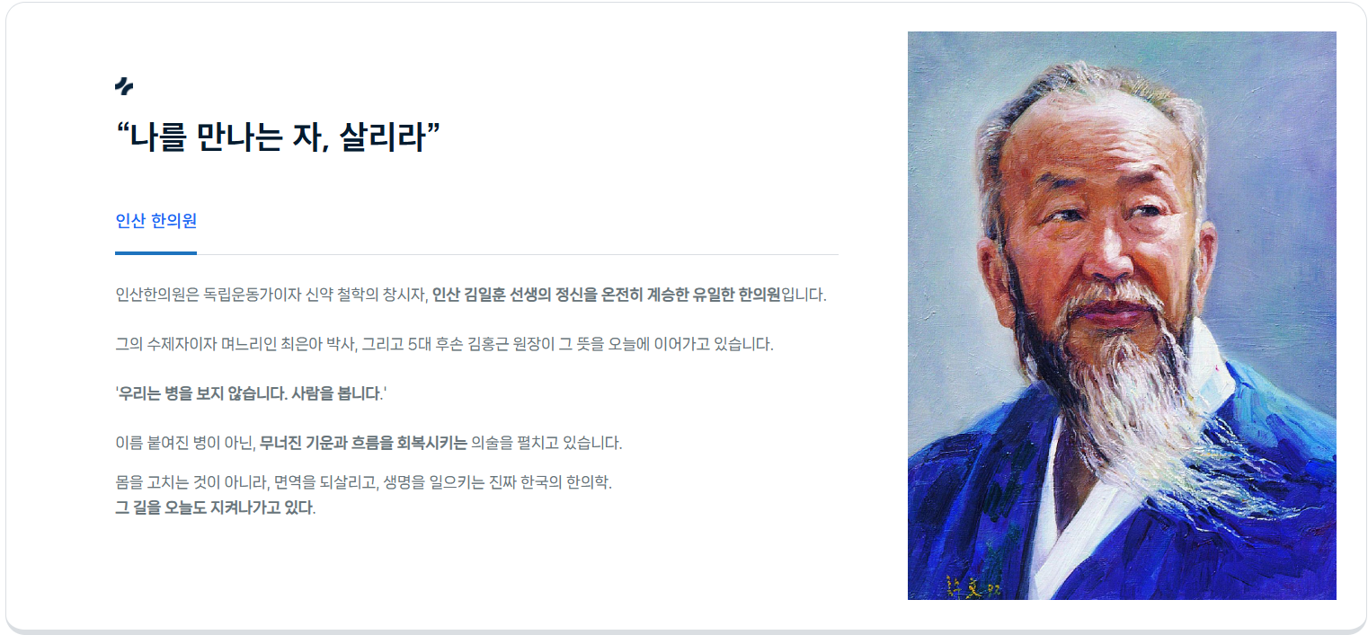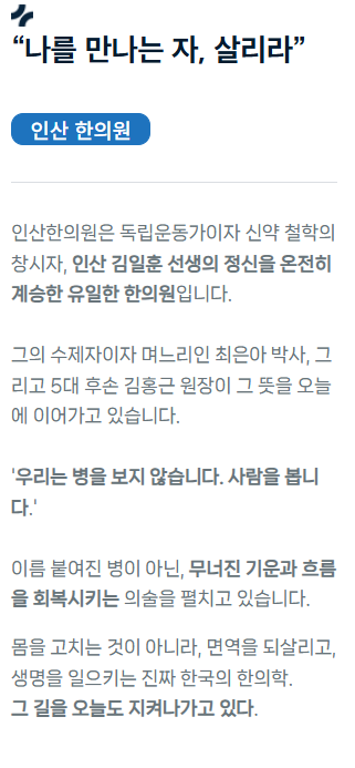 한의원 소개 인산한의원 소개 바로가기 평생 무료로 난치병 환자를 돌본 고귀한 인품, 전통 한의학을 혁신해 천연약용 신물질을 개발한 유례없는 천재성. 수많은 이들이 감동하고 선택한 5대 150년 전통의 인산의학 가문 – 인산한의원 인산한의원 소개 원장 인사말 찾아오시는 길 인산한의원 소개 원장 인사말 찾아오시는 길 인산한의원은 죽염발명가이자 한방암의학 창시자인 “의황” 인산 김일훈 선생의 처방과 정신을 계승한 의료기관입니다.인산 선생은 이미 100년 전에 수많은 현대인들이 화공약독으로 면역체계가 망가져 온갖 난치병과 만성질환으로 고통받을 것임을 예견한 바 있습니다.이에 대한 해법으로 제시한 인산의학은 100% 천연 약용 동, 식, 광물성 물질의 약성을 극대화해 우리 몸을 해독시키고 면역체계를 회복시켜 스스로 병을 뿌리째 뽑도록 하는 의술입니다.| 하지만 너무 늦게 병을 키워 오면 기적은 없습니다. 온라인상담 바로가기